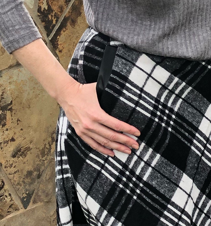 So, this skirt is an Amazon find! It's a very soft flannel sort of feel. It comes in a variety of plaids and solids, and it's around $35. Now, the sizing is a little tricky. I'm a reliable size 12 (my gym trainer is all, "Eat less dessert!", and I'm all, "No!") and the size XL is a tad tight (my gym trainer is all, "Vindicated!", and I'm all, "Fine, gimme a carrot") so if you're smaller than me, you should be fine, but you might find yourself still ordering up a size.